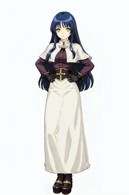 prompt: acoRO,1girl, white capelet, white dress, gloves, long sleeves, black pantyhose, long skirt