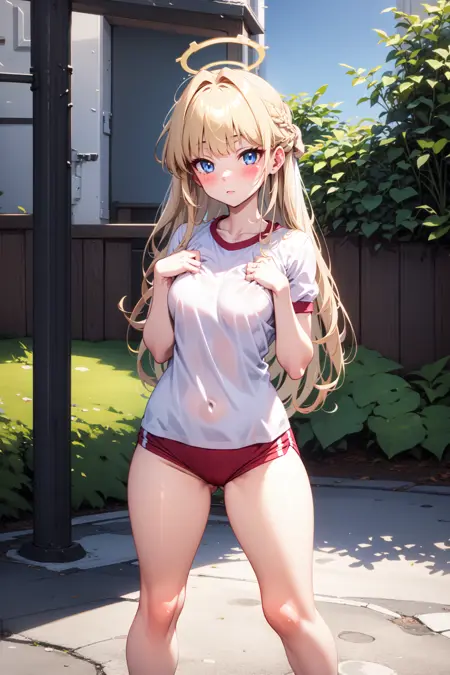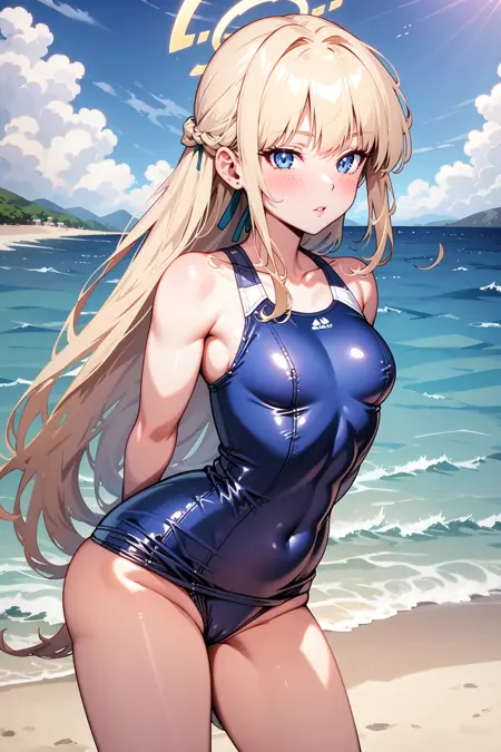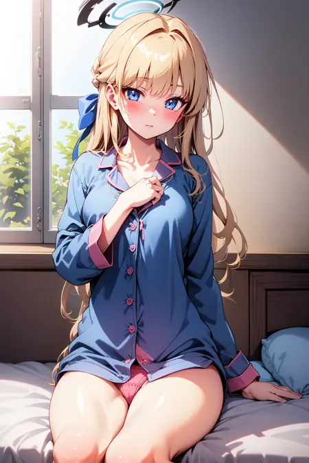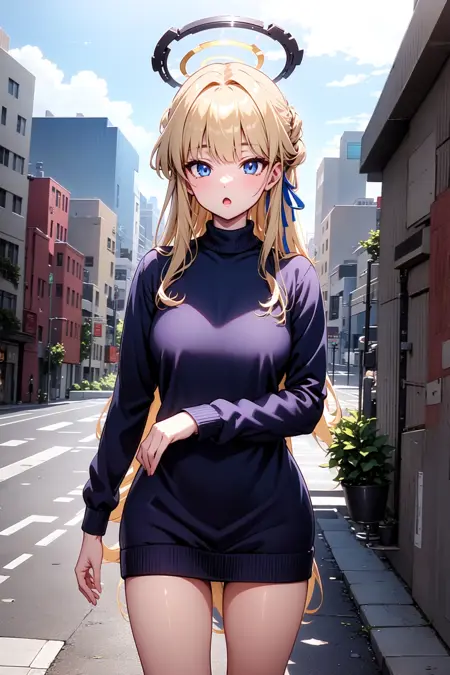 appearance: asumatoki, blonde hair, long hair, blunt bangs, blue eyes, halo,