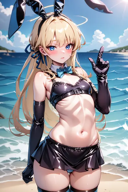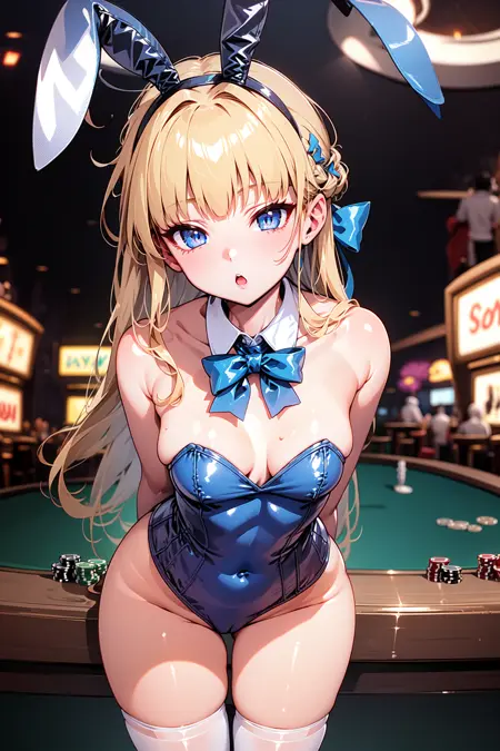 bunny outfit: blue leotard, blue bunny ears, white thighhighs, blue bowtie, blue hair ribbon,