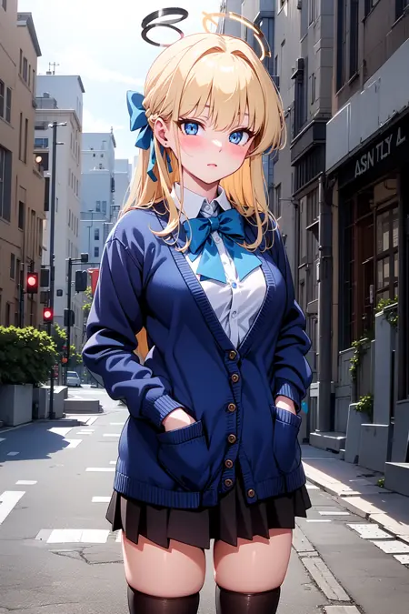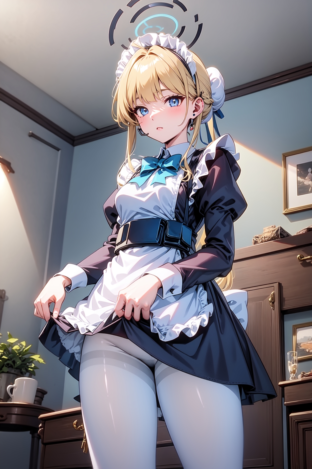 maid outfit: blonde hair, single hair bun, blunt bangs, blue eyes, halo, blue bowtie, blue hair ribbon, blue bow, maid uniform, maid apron, maid headdress, long sleeves, puffy sleeves, juliet sleeves, earpiece, harness, pouch, white pantyhose