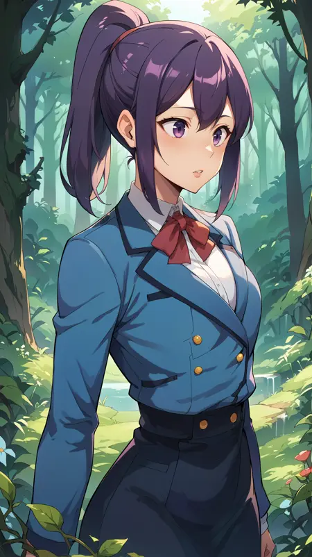 purple hair, ponytail, purple eyes, blue school uniform, skirt