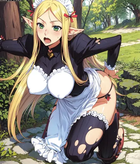 Notable tags: blonde hair, long hair, green eyes, long ears, maid costume, maid headress, ((mechanical arms)),