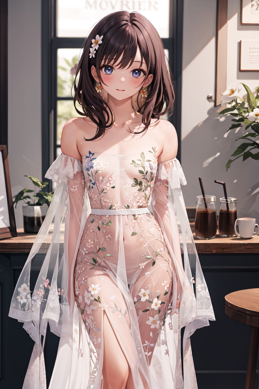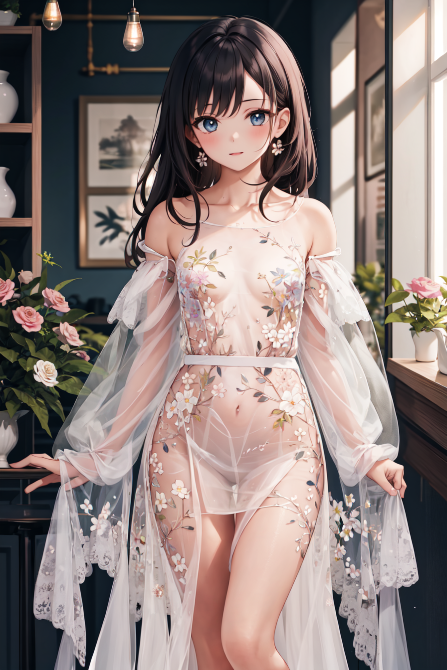 floral_see_through_dress, see-through dress, flower, bare shoulders