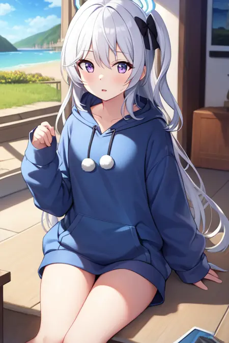 Hoodie Outfit : miyakojcBA, long hair, long sleeves, hood, sleeves past wrists,hoodie,one side up, halo, hood down, blue hoodie