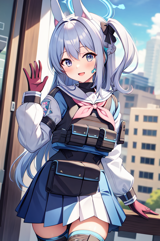 Default Outfit : miyakoBA, one side up, long hair,skirt, gloves, school uniform, long sleeves,serafuku, rabbit ears, neckerchief, fake animal ears, halo, knee pads, pink neckerchief, two-tone gloves, tactical clothes, bulletproof vest,