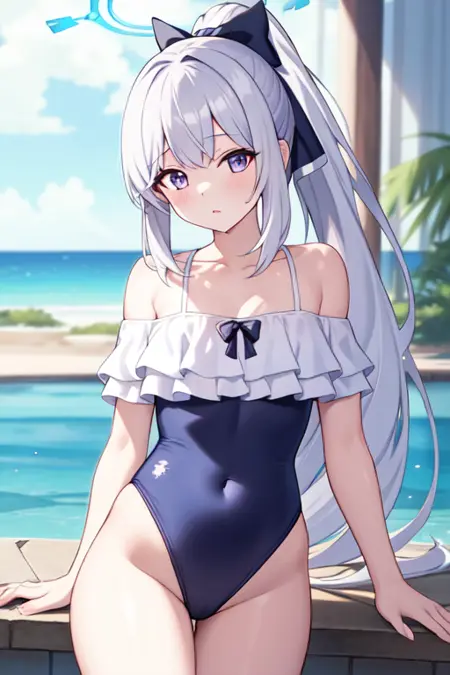 Summer Outfit : miyakosummerBA, long hair, ponytail, hair bow, frills, off shoulder, one-piece swimsuit,