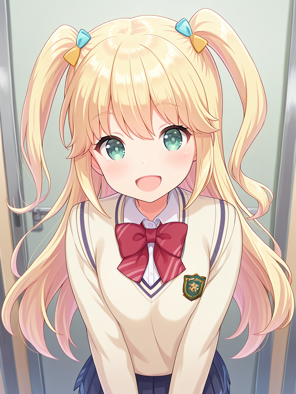 yuzu and blonde hair and long hair and green eyes and two side up and eyebrows visible through hair and bangs,