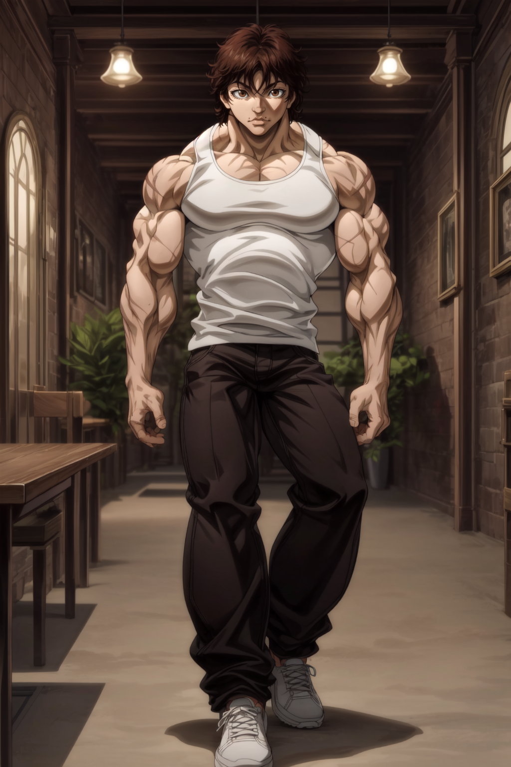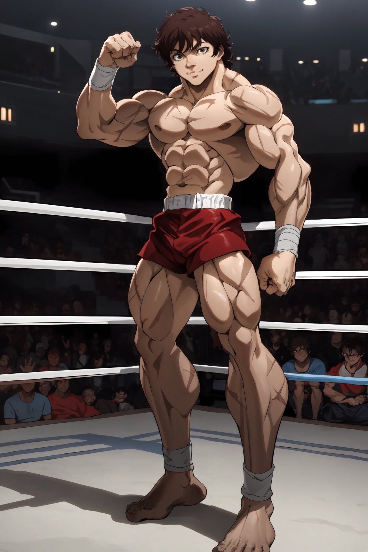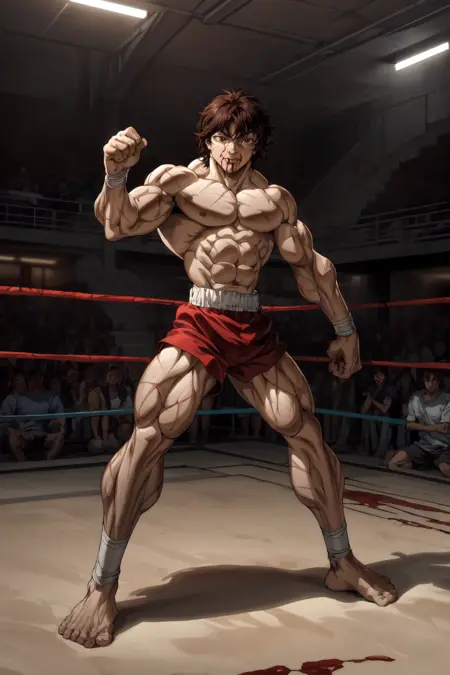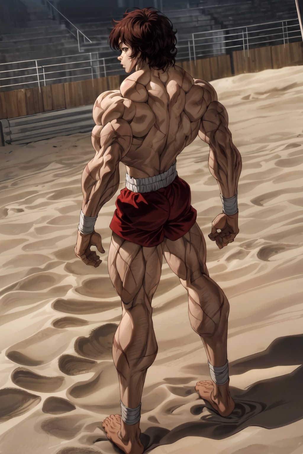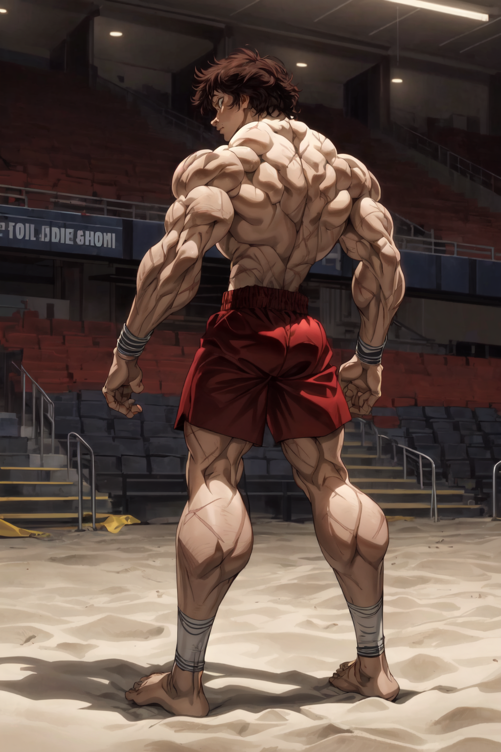 1boy, BakiHanma, male focus, solo, muscular, brown eyes, manly, abs, topless male, brown hair, shorts, scars,bandages