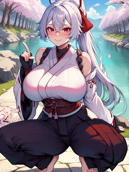 Defualt Outfit: "short kimino, (white kimino),(white sleeves), black undershirt, sleeveless turtleneck, (asymmetrical sleeves), hakama, (blue hakama pants), japanese clothes, (red fingerless gloves), detatched sleeves, single sleeve, (hip vent),"
