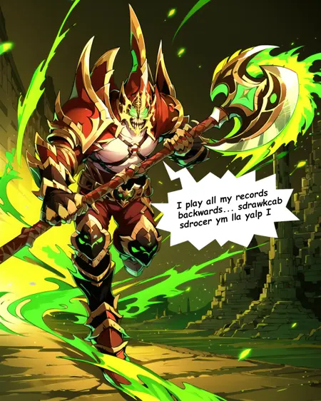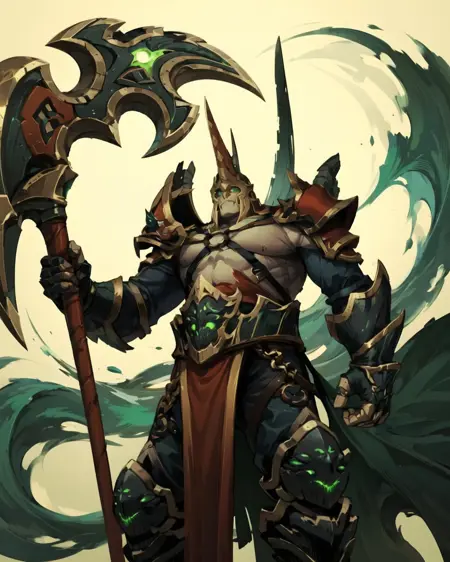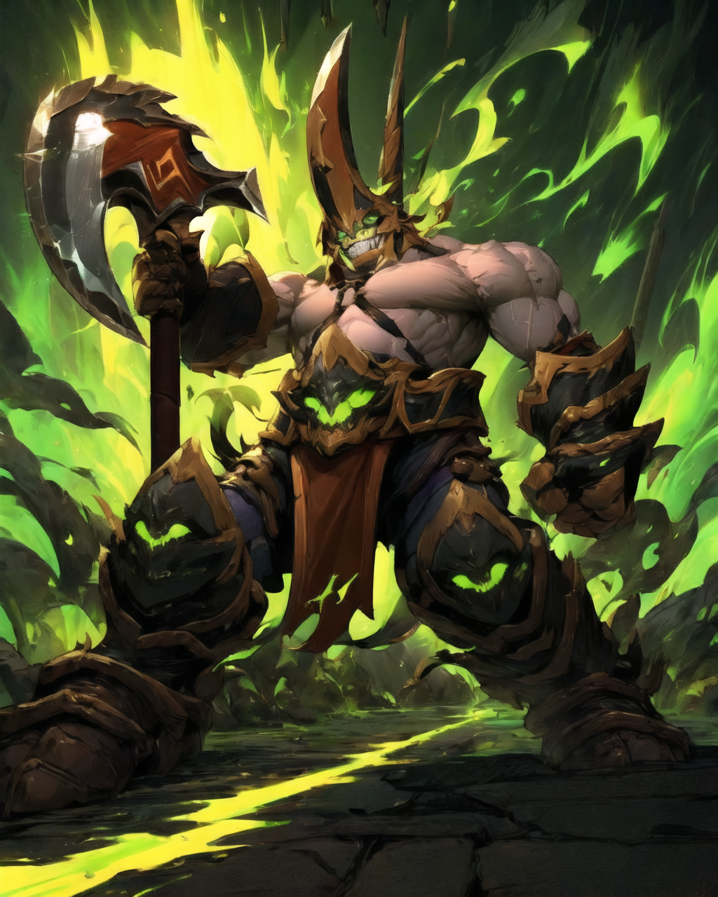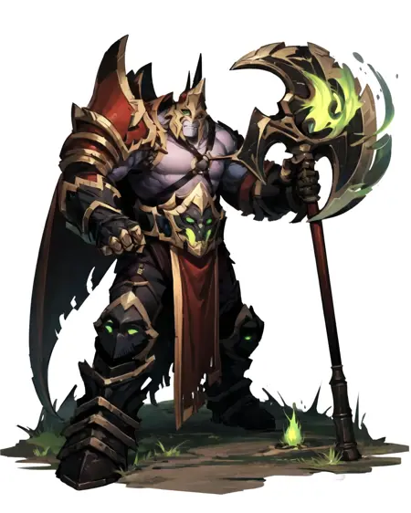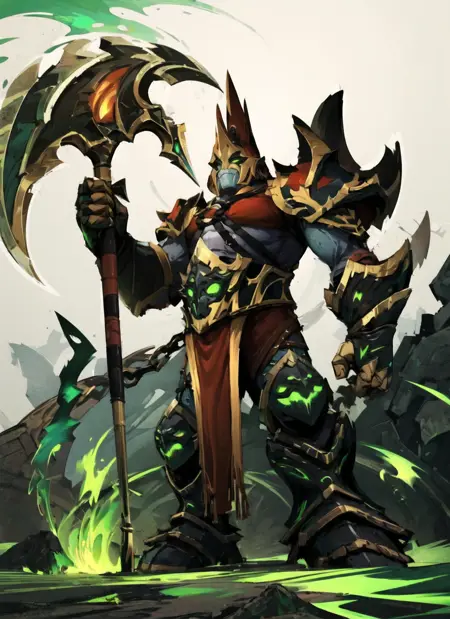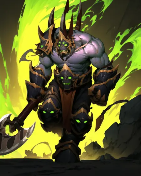 u can try felguard, holding weapon, holding axe, closed helmet, armor, green flame, demon mask, green eyes