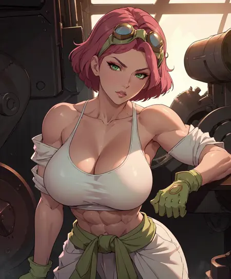 white_tanktop, green_gloves, goggles on head, white clothes, japanese clothes, midriff, red_sash, jacket around waist, bare_shoulders, bare_arms