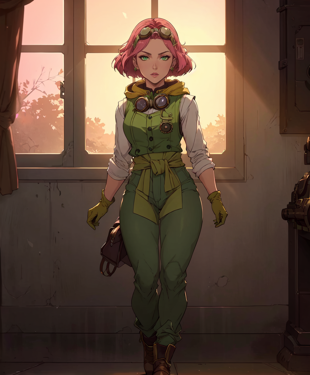 steampunk, goggles on head, sash, hair ornament, open_vest, longsleeve_white_bodysuit, green_gloves, yellow_hood, pants tucked in