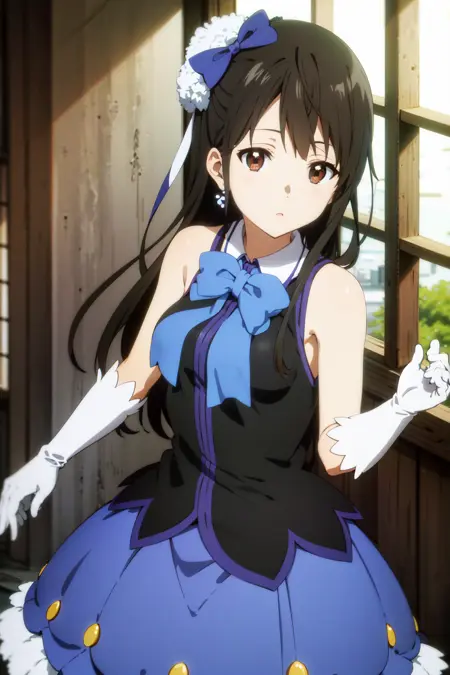 京阿尼风格, mitsuki2, 偶像, 1女孩, 手套, 单人, 长发, 黑发, 棕眼, 蝴蝶结, 白手套, 连衣裙, 发饰, 肩部裸露
