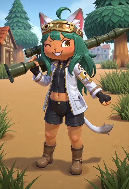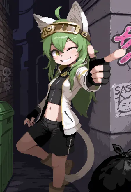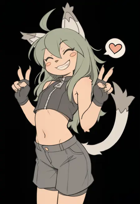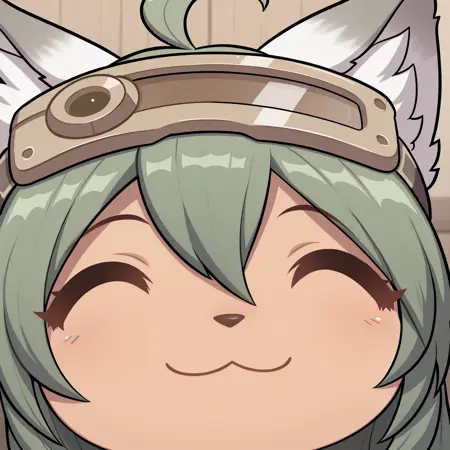 Useful tags: 1girl, furry female, cat ears, tail, animal nose, green hair, long hair, ahoge, closed eyes, ^ ^
