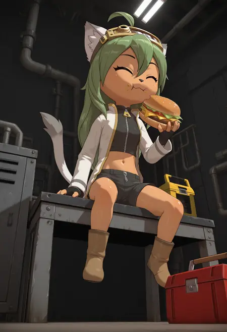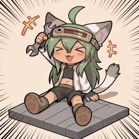 Taggings: furry female, cat girl, green hair, long hair, ahoge, animal ears, animal nose, closed eyes, ^ ^, tail