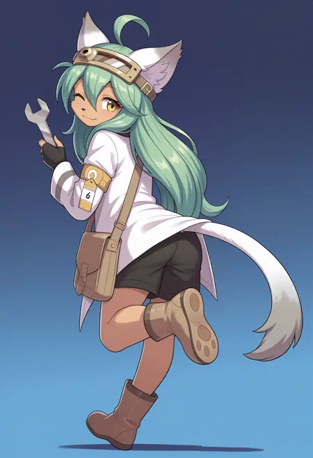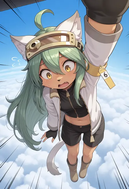 标签:兽耳女性、猫娘、绿发、长发、呆毛、动物耳朵、动物鼻子、闭眼、^ ^、尾巴