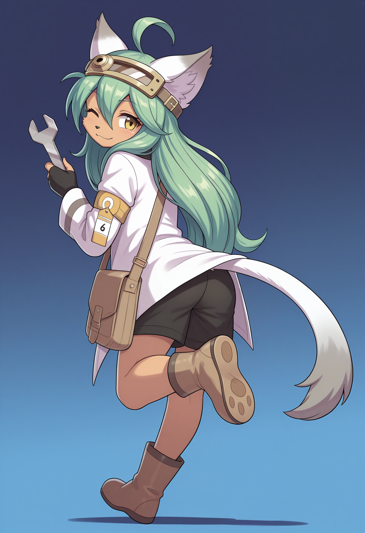 Outfit: white jacket, open clothes, undershirt, goggles on head, shorts, boots, finger gloves, armband, tag
