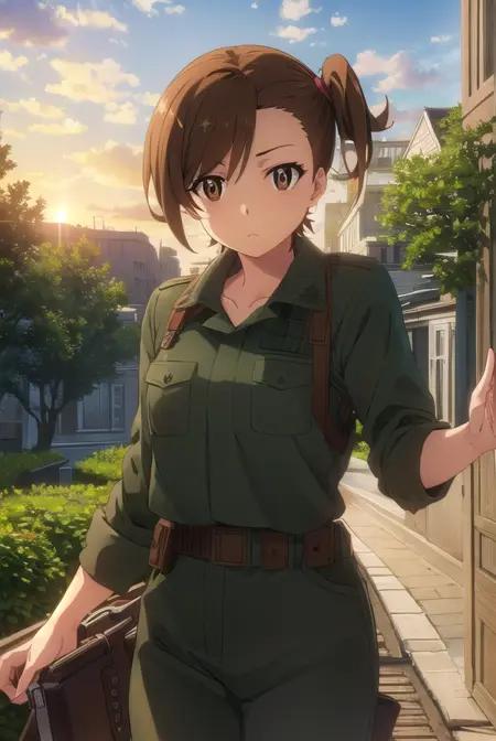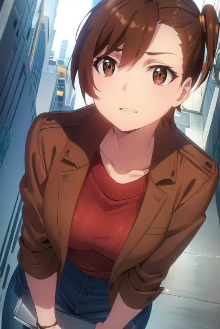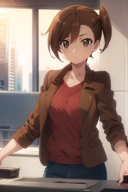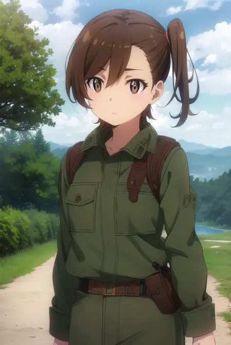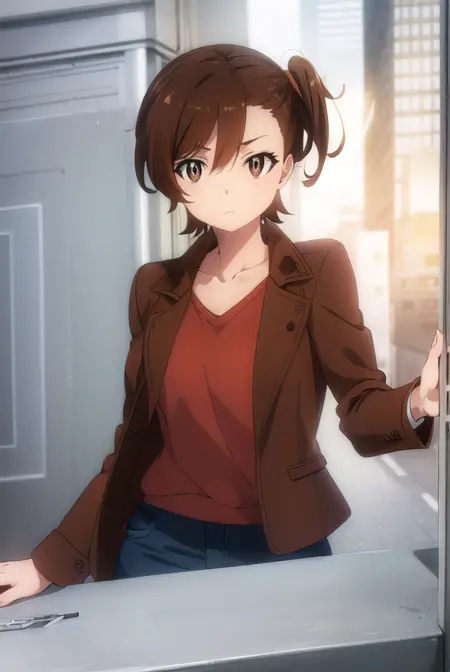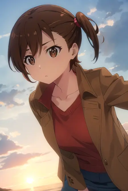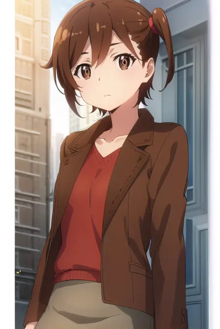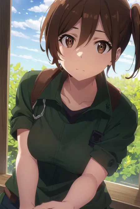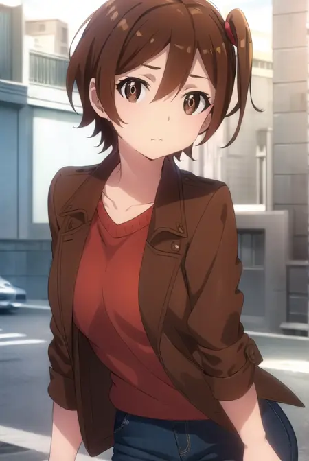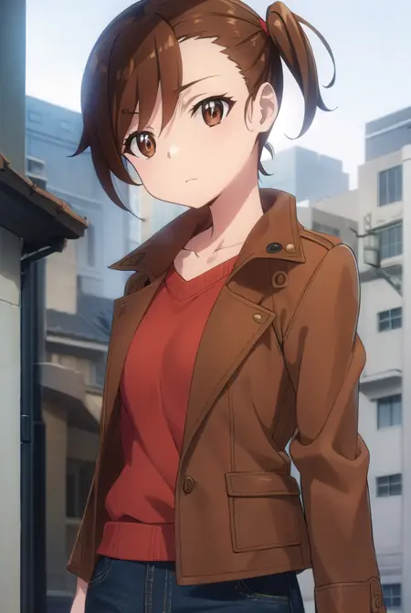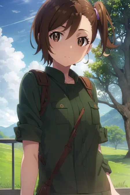 shino kuribayashi, short hair, brown hair, (brown eyes:1.7), side ponytail,