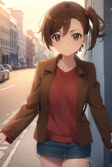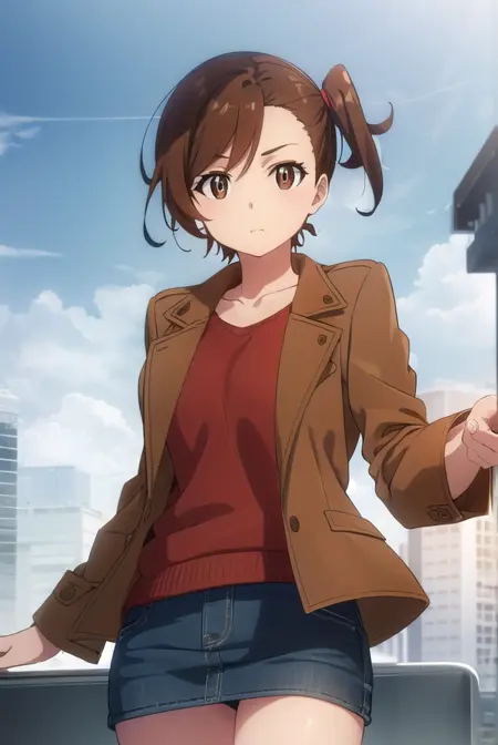 skirt, jacket, miniskirt, pencil skirt, denim skirt, sweater, (red sweater:1.2), brown jacket, collarbone,