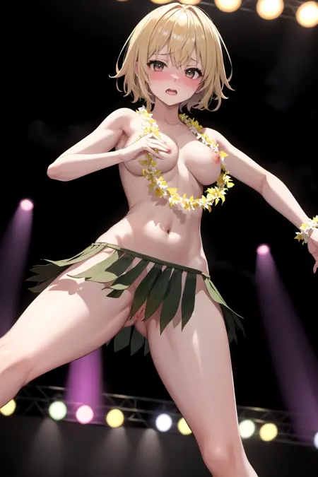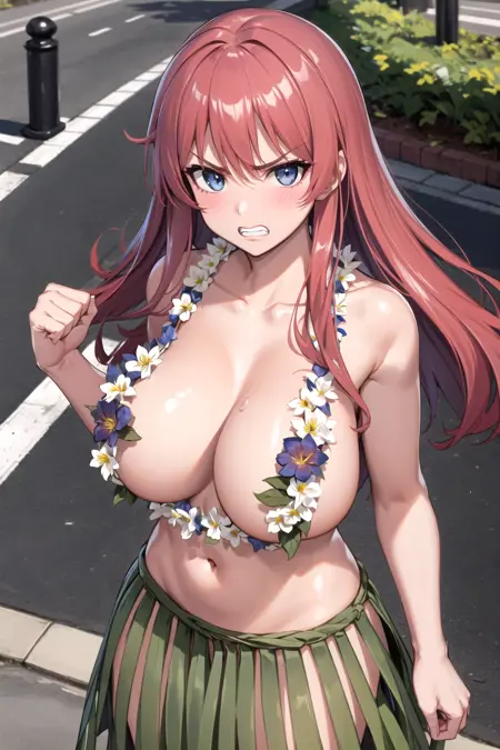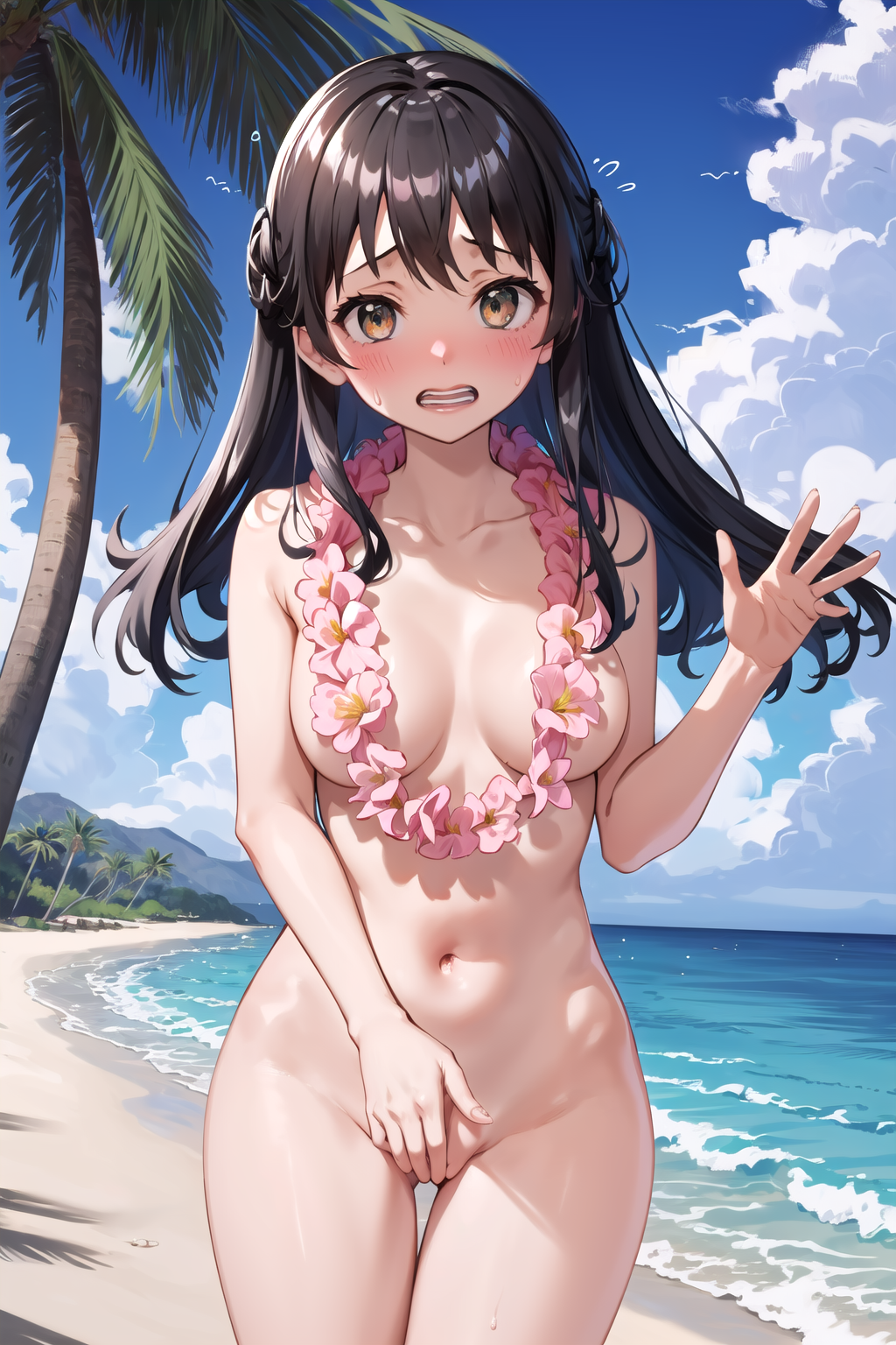 3. The lei will occasionally have odd colors or patterns near where the nipples would belong. To fix this, just add "nipples" to the negative prompt.