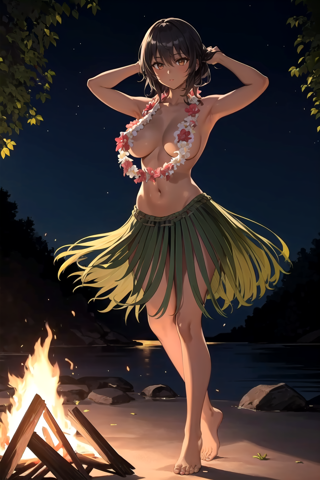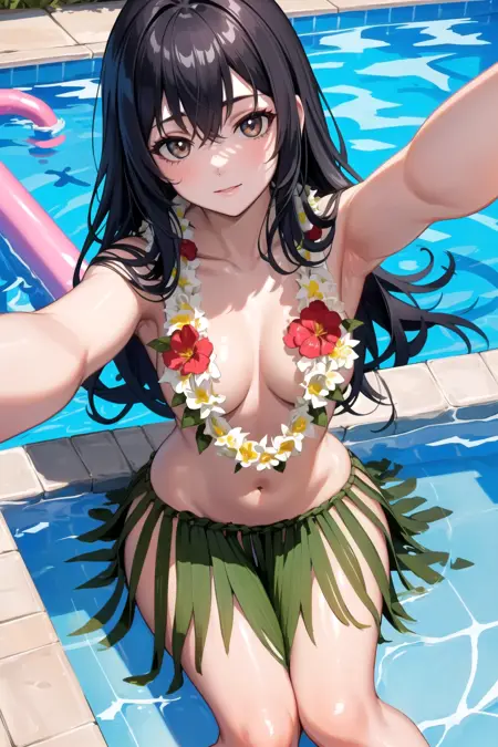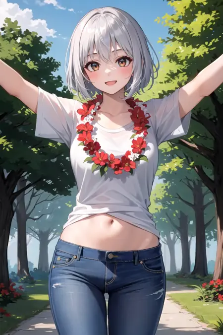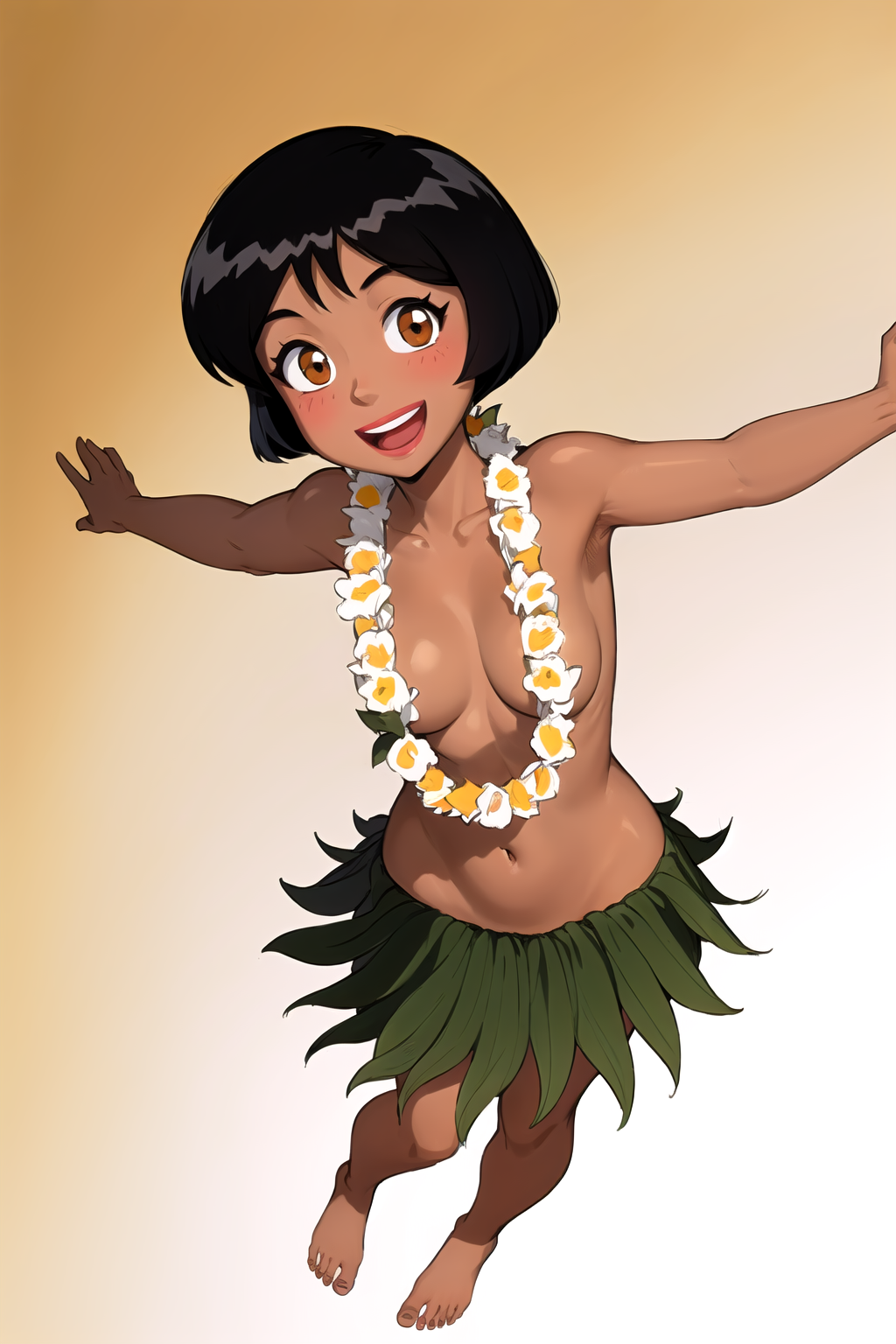 The LoRA is fairly flexible; for example, you can easily make your character wear a lei on top of a t-shirt and blue jeans. It can also do NSFW - see below for details.