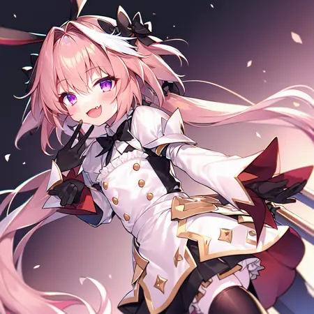 astolfo_saber, astolfo (fate), astolfo (saber) (fate), 1boy, otoko no ko, male focus, long hair, pink hair, blush, bangs, hair between eyes, twintails, purple eyes, white hair, hair bow, bow, ribbon, hair ribbon, multicolored hair, streaked hair, black ribbon, low twintails, hair intakes, rabbit, rabbit hair ornament,