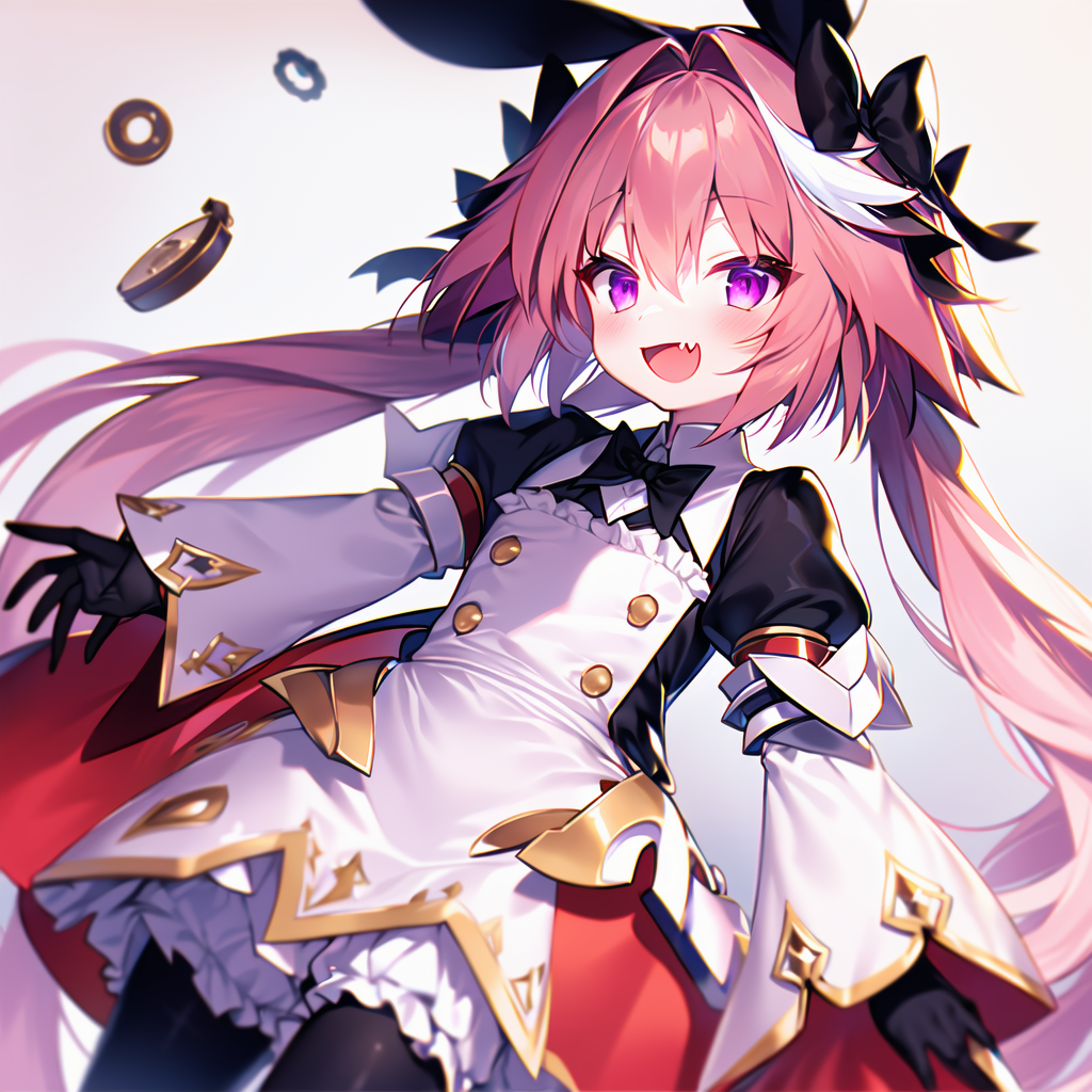 astolfo (saber) (third ascension), skirt, gloves, long sleeves, dress, black gloves, puffy sleeves, wide sleeves, bowtie, black dress, wing collar, black bow, buttons, skirt, white skirt, wing collar, juliet sleeves, black bowtie, layered skirt, pantyhose, black pantyhose, thighhighs, black thighhighs,