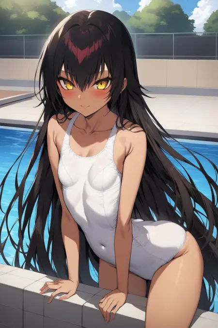White Swimsuit: 1girl, master_nemesis, to_love-ru_darkness, black_hair, very_long_hair, yellow_eyes, dark_skin, straight hair, solo, white_school_swimsuit, highly detailed, masterpiece, best quality, anime style,
