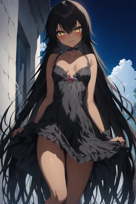 Black Dress: 1girl, master_nemesis, to_love-ru_darkness, black_hair, very_long_hair, yellow_eyes, dark_skin, straight hair, solo, dress, highly detailed, masterpiece, best quality, anime style,