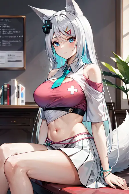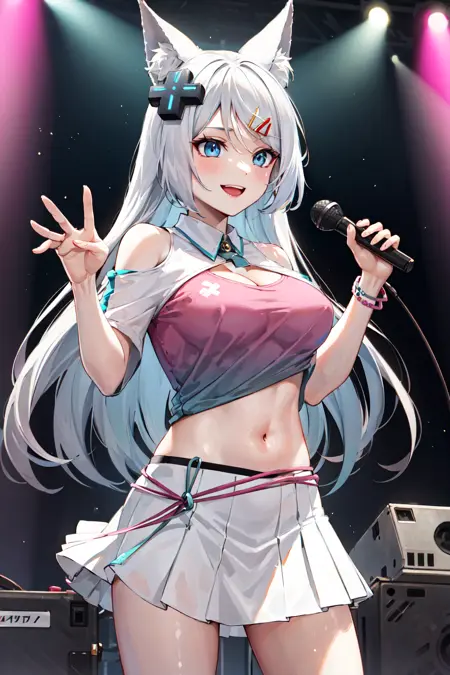 mizuki (vtuber), 1girl, solo, animal ears, blue eyes, white skirt, pleated skirt, d-pad hair ornament, fox ears, hairclip, fox tail, miniskirt, pink shirt, multicolored hair, anklet, large breasts, white hair, very long hair, jewelry, bare shoulders, bangs, clothing cutout, see-through, blue hair, navel