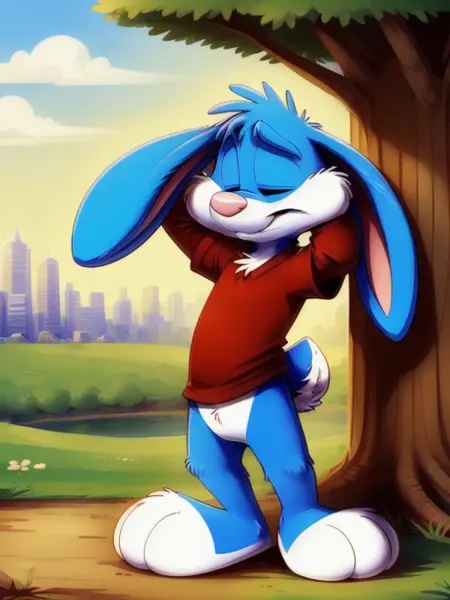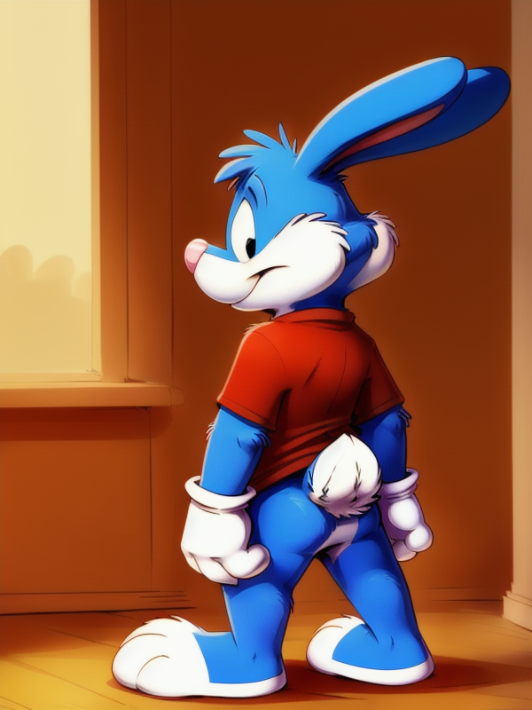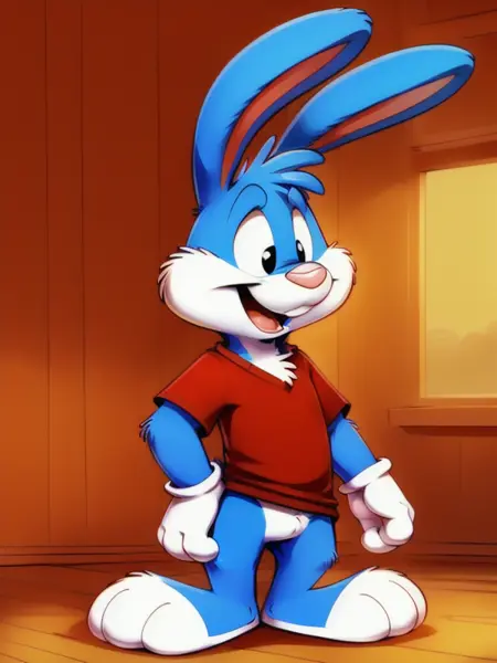 Standard tokens: Baster, bunny, male, blue body color, white cheeks, white legs, white gloves on hands, pink nose, white tail, blue ears, erect ears, rabbit teeth, colorless eyes, Red T-shirt