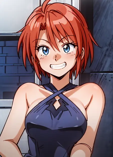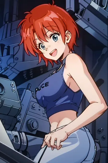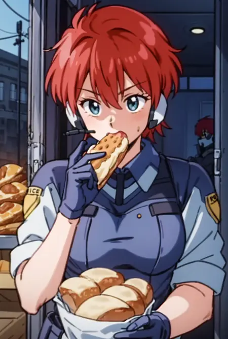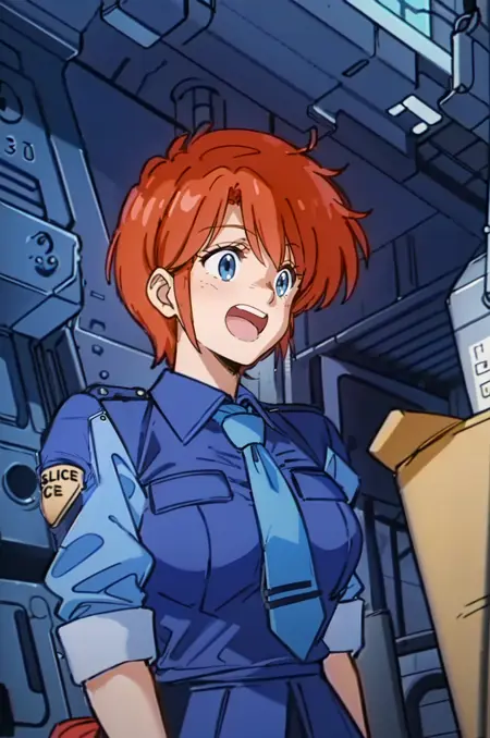 prompt like: leonaozaki, 1girl, red hair, short hair, mature, solo, police uniform,