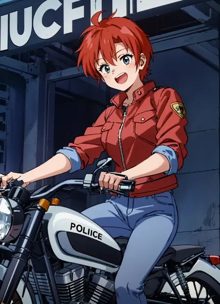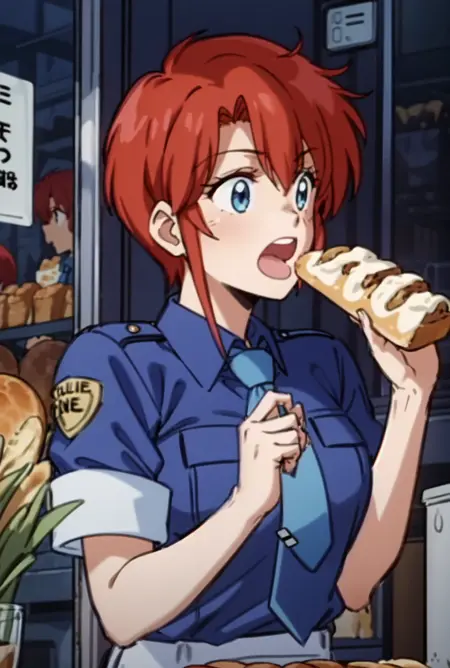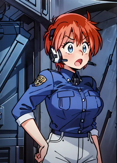 プロンプト例:leonaozaki, 1girl, red hair, short hair, mature, solo, police uniform, blue blouse, short sleeves, hands raised, pants, necktie, mouth closed, grin