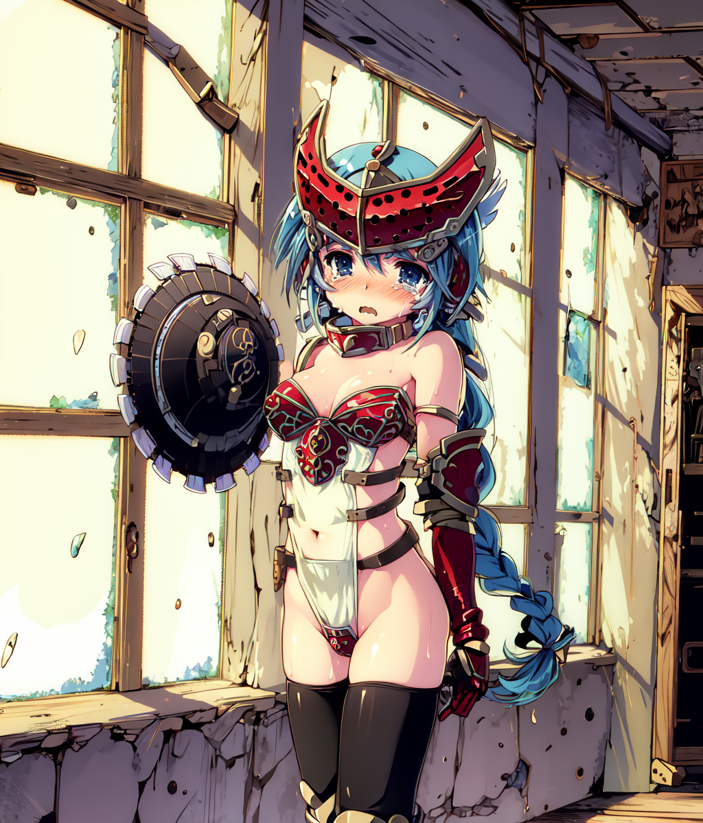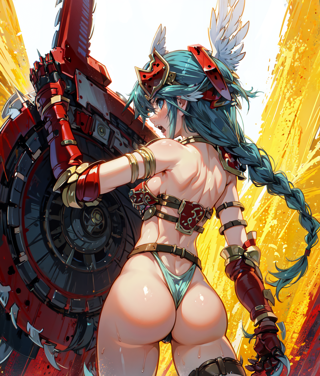 Notable tags: blue hair, braid, valkyrie headband, swimsuit armor, gauntlets, greaves, armor,