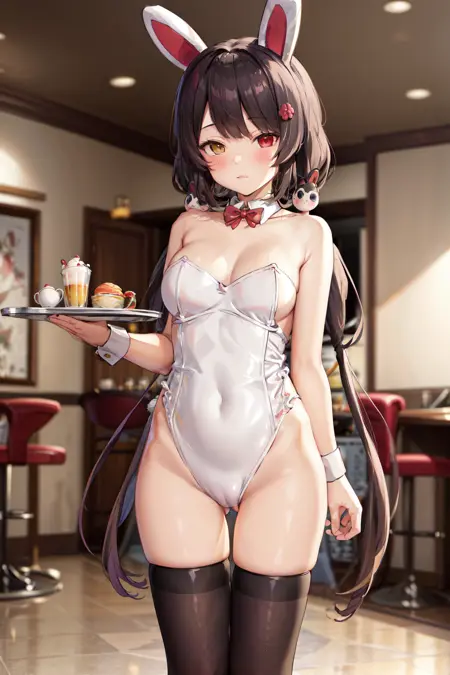 - eetoko、犬の耳、異色瞳、短い髪、前髪、髪飾り、髪の装飾品、ネックレス、透け感、黒いドレス、長袖、犬の尾、ハイヒール、黒い靴