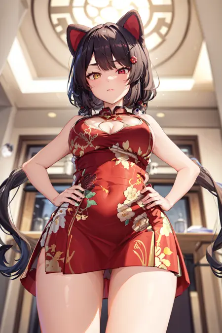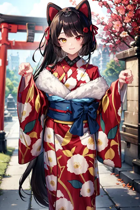 - ddtoko、犬の耳、異色瞳、長い髪、前髪、髪リボン、赤いリボン、髪飾り、赤い花、髪の装飾品、ファー縁取り、ファーのスカーフ、日本の衣装、着物、赤い着物、プリント着物、振袖、帯、長袖、広い袖、帯、青いリボン、花柄プリント、赤い爪、犬の尾、靴下、靴、プラットフォームシューズ、黒い靴