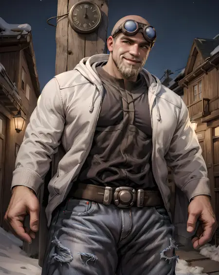 //这将生成身穿装甲、佩戴标志性护目镜的达蒙·贝德,他秃顶、留着白色胡须,因年老而出现皱纹