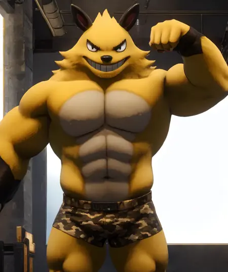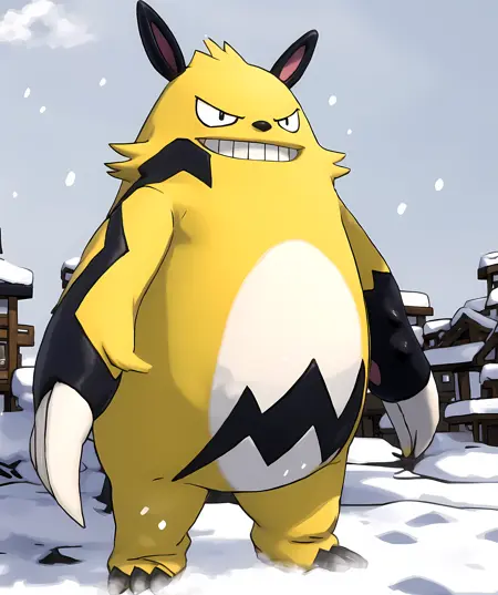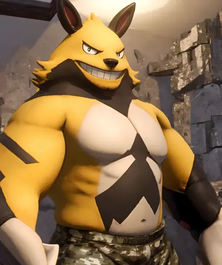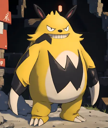 I made Grizzbolt LoRA from Palworld. For thos you don't know, Grizzbolt is a creature or Pal that came from Palworld. The design of Grizzbolt is a fusion of Totoro from My Neighbor Totoro, Electabuzz and Electivire from Pokemon. He basically front page of Palworld image that carrying gatlin gun.
