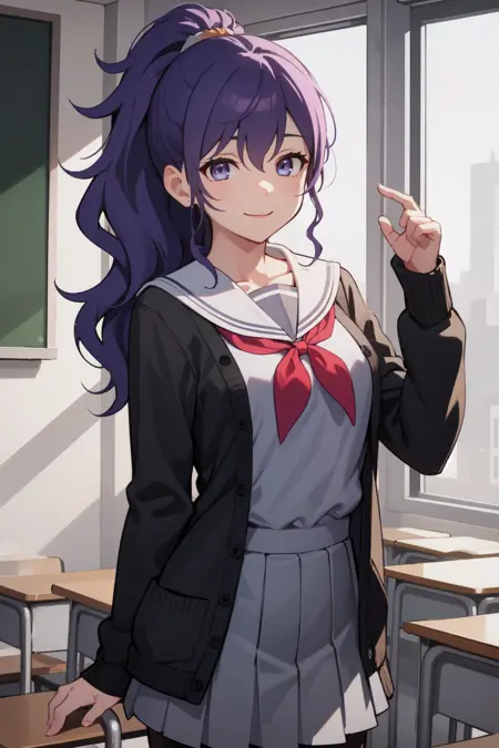 | 训练词汇 | amsekai, purple eyes, blue eyes, high ponytail, hair scrunchie, serafuku, black sailor collar, choker, black neckerchief, black shirt, black skirt, long skirt已复制! amsekai, purple eyes, blue eyes, high ponytail, hair scrunchie, school uniform, (white sailor collar:1.1), red neckerchief, grey shirt, cardigan, grey skirt, pantyhose已复制! |