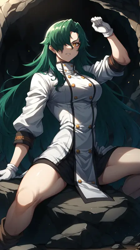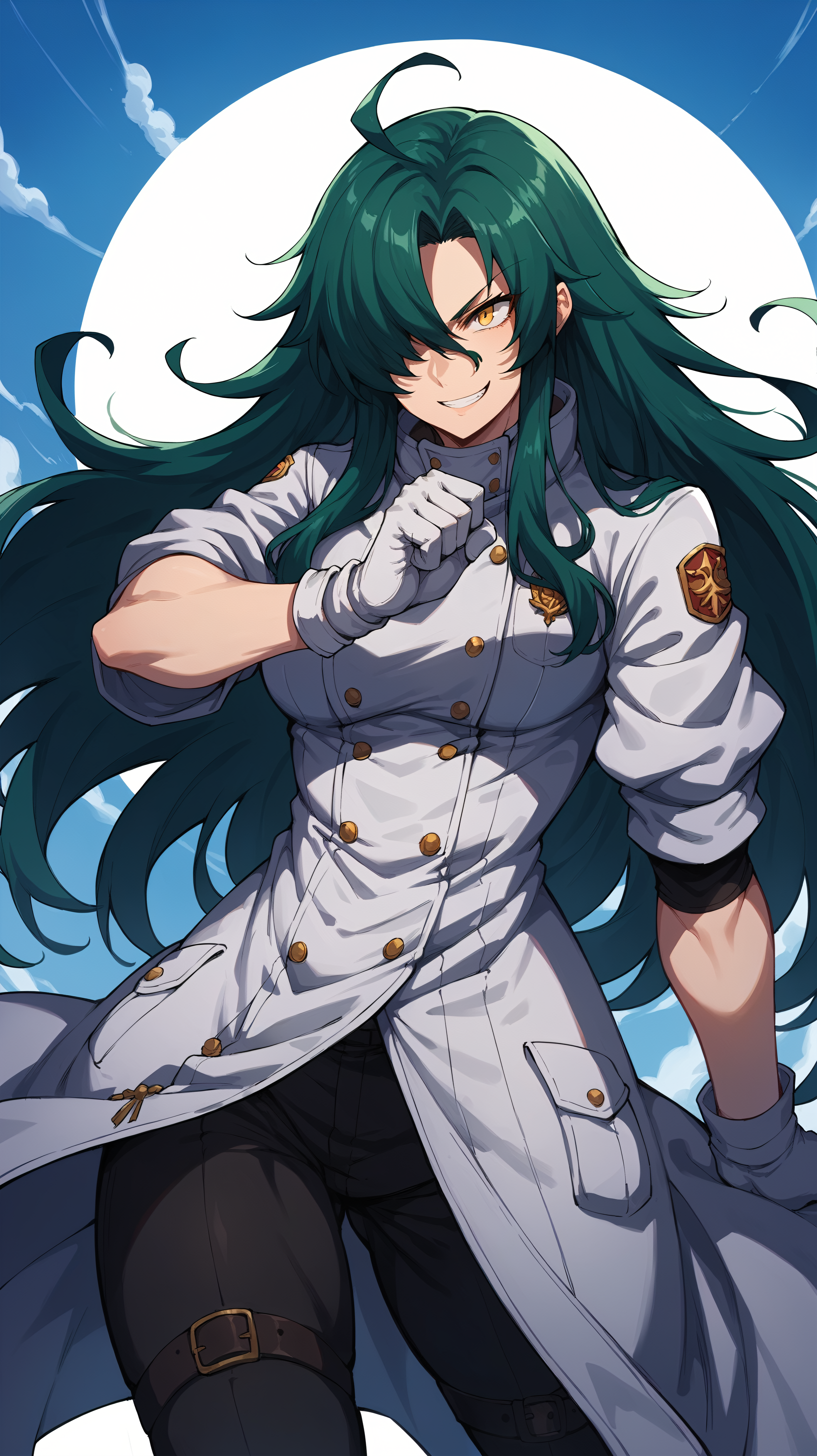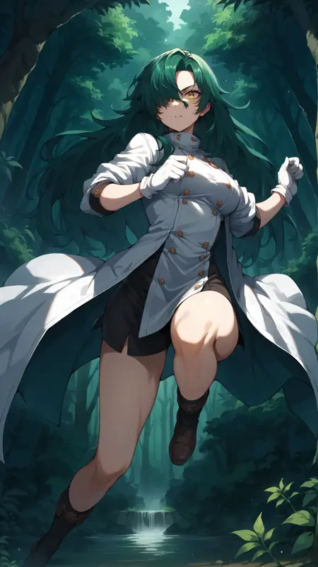 long hair, green hair, yellow eyes, hair covering one eye, long coat, white coat, white gloves