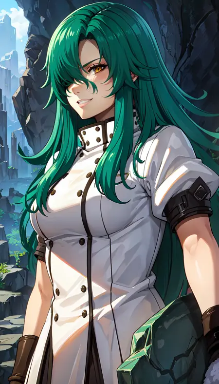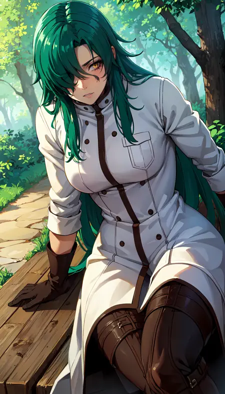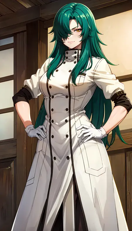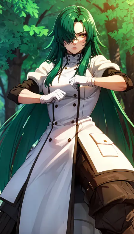 long hair, green hair, yellow eyes, hair covering one eye, long coat, white coat, white gloves