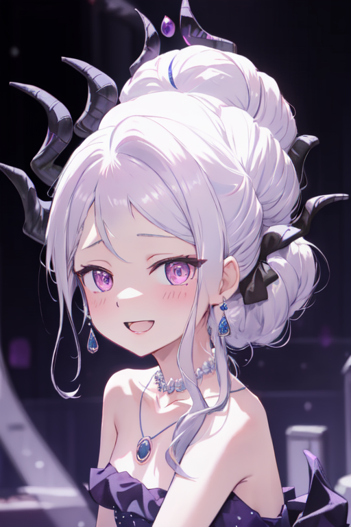 TAG:hina,1girl,solo,ponytail,elbow gloves,purple dress,black gloves,black dress,strapless dress,earrings,necklace,alternate costume,