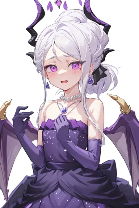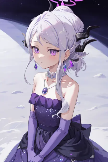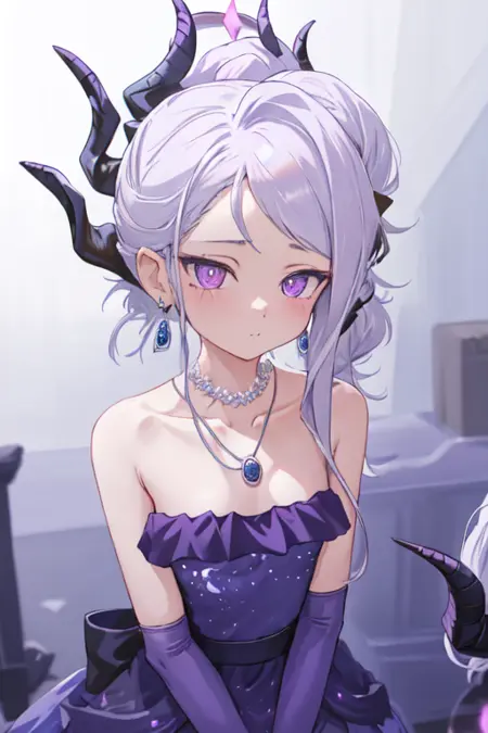 TAG:hina,1girl,solo,ponytail,elbow gloves,purple dress,black gloves,black dress,strapless dress,earrings,necklace,alternate costume,