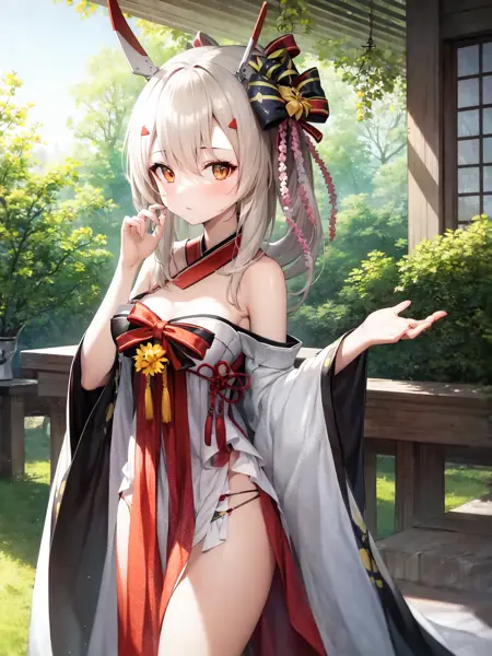 kimono, silver_hair, off_shoulder, hair_ornament, navel,
