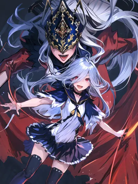 • Extra elements : Frog stuffed toy,puppet string,marionette called Victoria with red dress and mask ( seems very hard to generate when using prompts like 1girl or solo , I suggest 2girls or 1girl and 1other/marionette ) ;