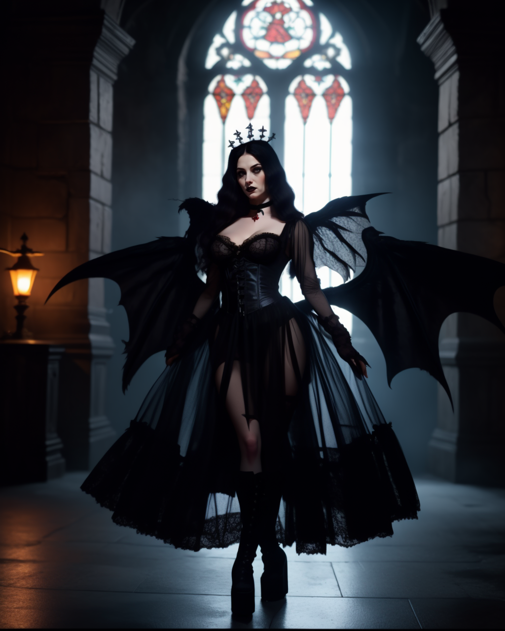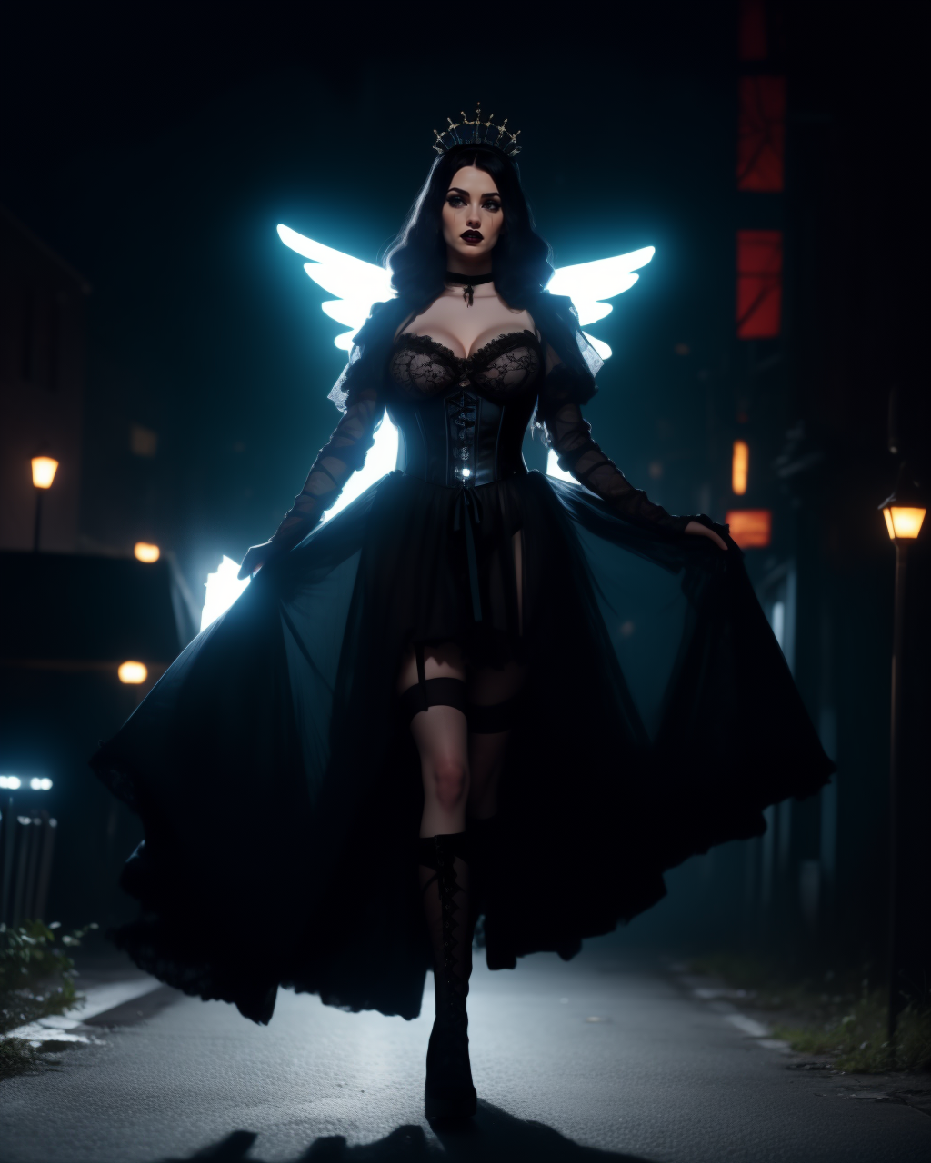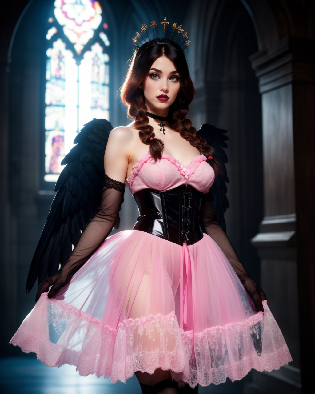 다음과 같은 단어 뒤섞임으로 헌물을 불러내세요: g0th, 화려한 치마, 목걸이, 십자가, 부츠, (고트식 머리장식), 팔꿈치 장갑, 플랫폼 힐, 메쉬, (투명:1.2), (긴 검정/분홍/하얀/파란/빨간 드레스)