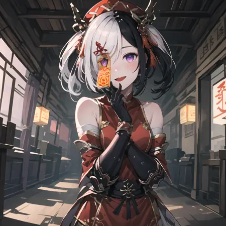 Basic characteristic : Black hair,two-tone hair,purple eyes,ofuda ( over one eye,one eye covered with ofuda ),twintails / long hair ;