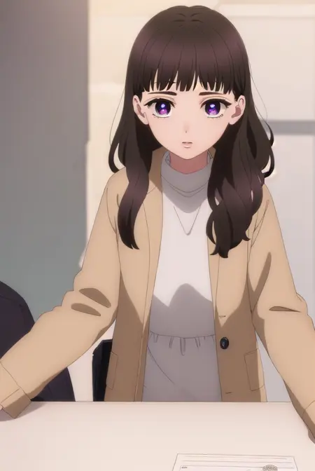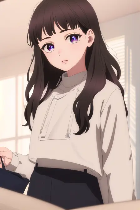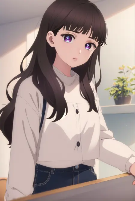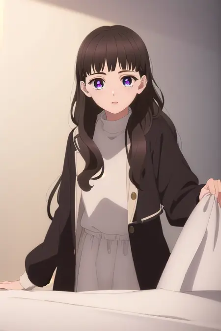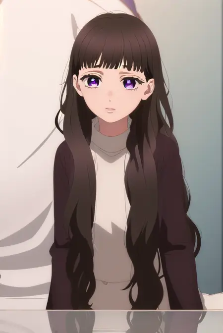 emma nakazono,长发,刘海,棕色头发,黑发,(紫色眼睛:1.1),齐刘海,波浪发,
