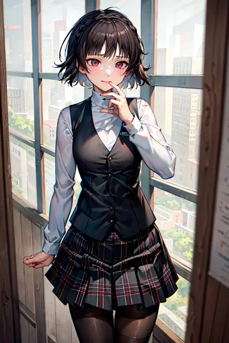 MakotoP5, wearing a CasualCL, CasualCL, long sleeves, vest, black pantyhose, plaid skirt - 일관되게 학교 복장으로 표현합니다.