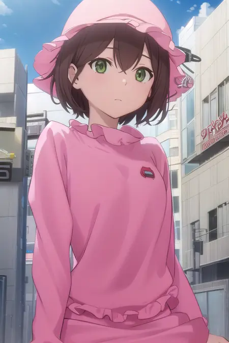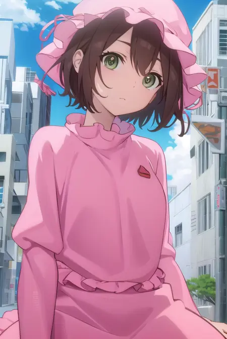 hat, frills, dress, pink dress, pink hat, long sleeves, puffy sleeves, skirt, pink skirt,